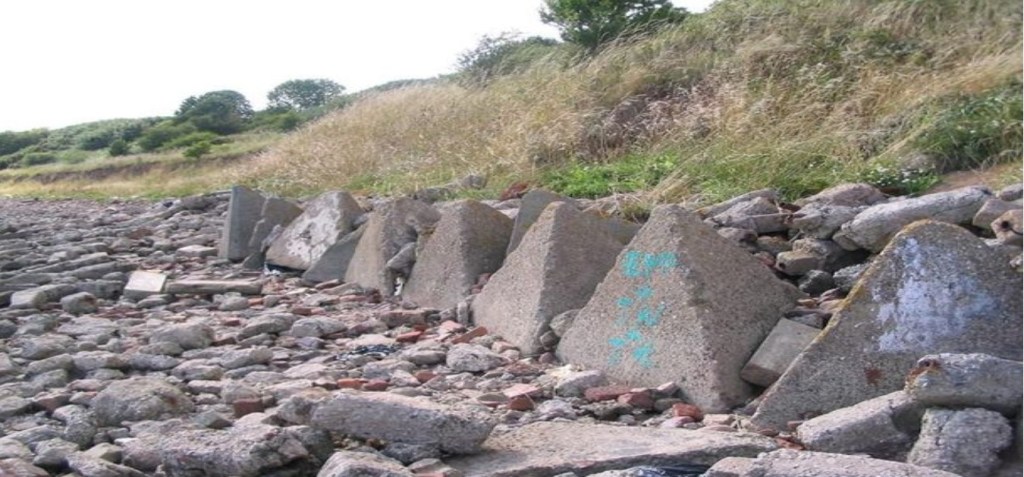 The path continued down, the grassy bank was waterlogged with recent rain and easily turned to mud. Before them was a clearing, the remains of a stone wall ran along the river’s edge, a clear flat area was visible, to the left concrete pyramid structures bunched together like abandoned kids building blocks.