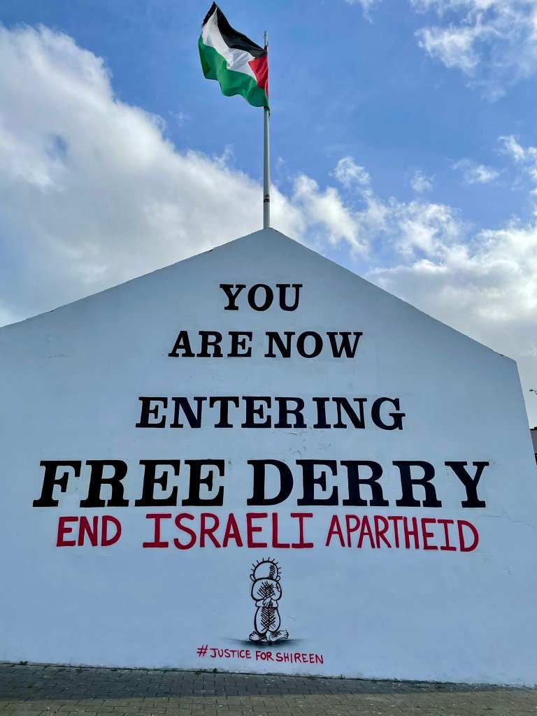 The marching bands formed high up in the Creggan estate and their rhythms filled the streets. Palestinian flags were everywhere on the march in solidarity with those in Gaza suffering the bombardment from Israel, and for a ceasefire. The wind and rain were determined to whip the march and the flags. but the effect was only to make them fly with more pride and passion. People joined the march from from the council estates on the long route downhill so by the time it reached Free Derry Corner it had doubled in size. It was a quiet march, no slogans or chants, either in deference to the wind and rain or the fact that it was the annual commemoration for the fourteen unarmed civilians killed by the British Army in 1972.
